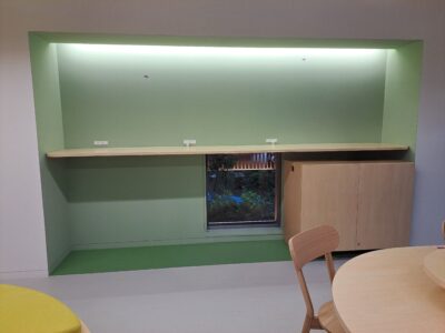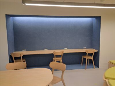 共用室は壁が塗装であったり、床がタイルであったりと専有部とは違う施工で大変ですが職人さん達が一つ一つ丁寧に施工しました。