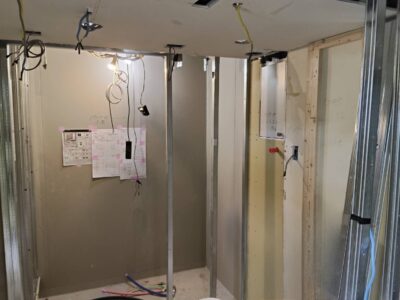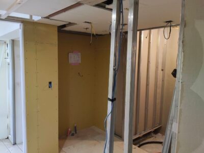 解体工事が終わり、下地組み・ボード貼り・建具枠の取付・電気工事などが進められています。