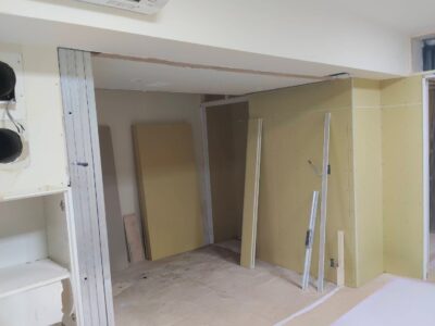 最後に石膏ボードなどの仕上げ材を軽量鉄骨に取り付け、壁や天井の形が完成します。