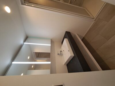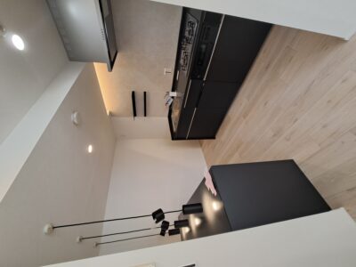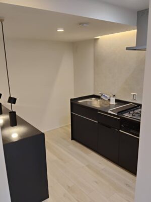 更に建具の扉の表面も新しくし、ダウンライトもアップデートしたことで明るく美しい仕上がりになり、白と黒を基調とした明るくスッキリとした印象の素敵なお部屋が完成しました。